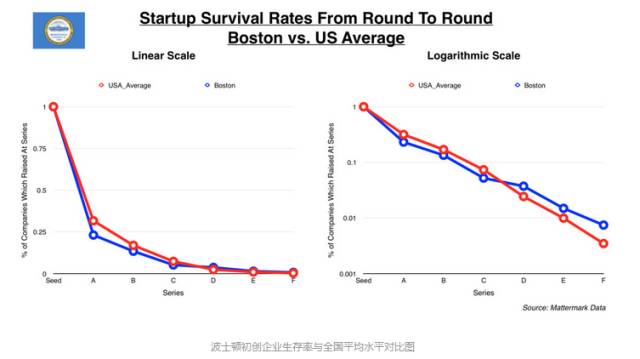 由上图可以看出,纽约和旧金山的初创公司生存率都高于全国平均水平,而波士顿的初创公司在早期融资的表现落后于全国平均水平,但是到 C 轮融资之后开始呈现赶超趋势。