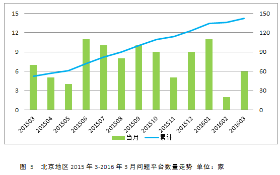 截至2016年3月31日,北京至少出现过142家问题平台,占本区域全部平台的33%。2016年3月,北京出现6家问题平台,其中3家歇业停业,1家网站关闭,1家提现困难,1家失联。图5显示,统计期间,各月问题平台数量均在11家以下,春节后问题平台数量较之前有一定下降。