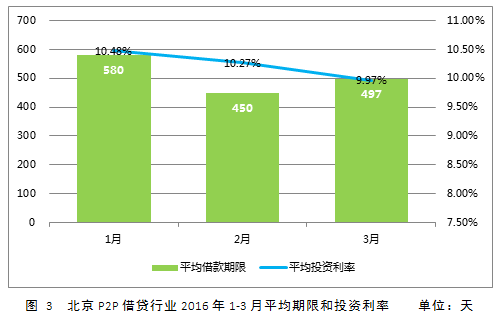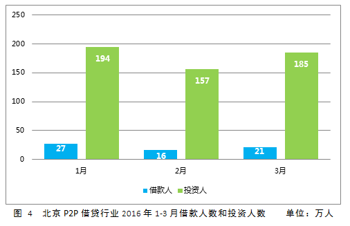 2016年3月份,北京地区活跃借款人数约为21 万,投资人数185万左右。借款人及投资人均环比上涨,分别上涨约18%、31%;1月至3月,单个借款人对应的投资人在7人至10人之间,3月投资人与借款人之比为8.8。