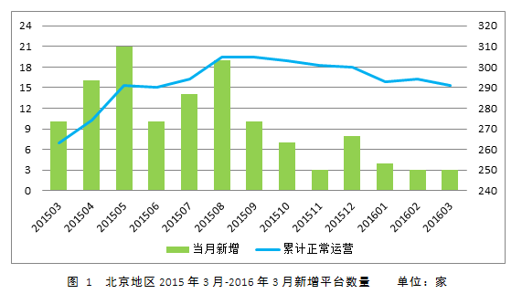 据零壹研究院数据中心统计,截止至2015年3月31日,北京地区至少有433家线上笔2笔借贷平台,其中正常运营的约有291家。图1显示,除部分月份外,笔2笔平台新增数量自2015年8月以来整体呈下降趋势。