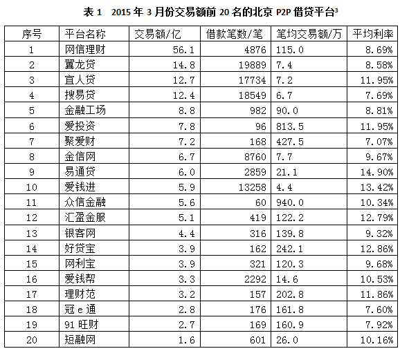 表1列出了本月成交额前20家的北京笔2笔平台,其中月交易额在10亿元以上的平台共有3家,分别为网信理财、翼龙贷、宜人贷。网信理财以56.1亿元交易额登顶;第二名翼龙贷月交易额14.8亿元;宜人贷月交易额12.7亿元,居本月第叁。月交易额超过5亿元的平台共11家,较上月的8家增加3家。前20名平台中,17家平台交易额较2月环比上涨,涨幅最大的3个平台为理财范(193%)、众信金融(129%)、宜人贷(96%);3家平台月交易额环比下降,分别为翼龙贷、金信网、91旺财。
