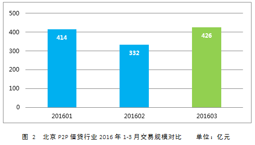 2016年3月份北京P2P借贷行业整体交易额约为426亿 ,环比涨幅为28.2%。3月成交额大幅上涨的原因主要有两方面:一是春节期间(2月)成交量低迷;二是3月行业整体回暖。大平台交易额总量占行业整体成交量比重较大,3月交易额前20名的平台交易额占到行业整体交易量的41%左右。